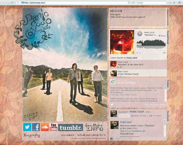 ポストロックバンドのPANIC SOUPからの依頼で作成しました。Webデザイン・ロゴ作成・写真の加工をしております。バンドからの要望により、各種SNSのハブ的役割と、有機物かつ人工的なイメージを表現できるように作成しました。