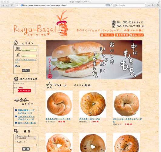 手作りベーグル Rugu-Bagelのショップページとして作成しました。 Rugu-Bagelのトップページのデザインをベースにアレンジしました。