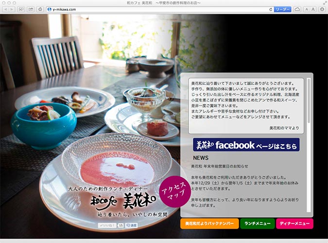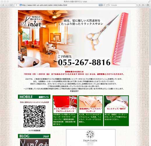 町外れの隠れ家サロン inletのサイトです。美容院店内の明るい雰囲気の写真を各所に配置しました。また天然素材をたっぷり使っている体に優しい印象を持ってもらえるように配慮しました。 |